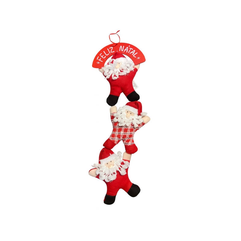 Guirlanda decorativa de Natal em formato vertical, composta por três simpáticos bonecos de Papai Noel ligados entre si. Cada Papai Noel é confeccionado em tecido macio, com barba felpuda, gorro e roupa vermelha, sendo o boneco central decorado com estampa xadrez tradicional natalina.