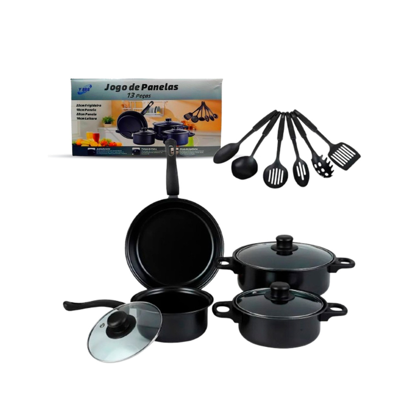 1 Jogo de Panelas 13 peças Preto com Tampa de Vidro Y888