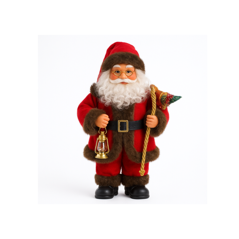 Encante sua decoração natalina com este adorável Papai Noel animado, feito com ricos detalhes e acabamento de alta qualidade. Vestido com seu tradicional traje vermelho com detalhes em pelúcia marrom, ele segura uma lanterna dourada e um bastão decorado com enfeite natalino colorido, transmitindo todo o charme e a magia do Natal.